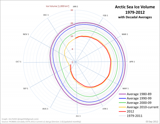 This summer has seen an extraordinary melt season in the Arctic, which has led to a catastrophic and unprecedented loss of sea ice. The rate at which the Arctic Ocean has lost ice volume is illustrated brilliantly by a series of graphs on Jim Pettit’s website. These graphs make depressing viewing – there can be no clearer illustration of the environmental impacts that our reckless global-scale atmospheric chemistry experiment is having. To me perhaps the most dramatic is this graph of the PIOMAS data on Arctic Sea Ice Volume: